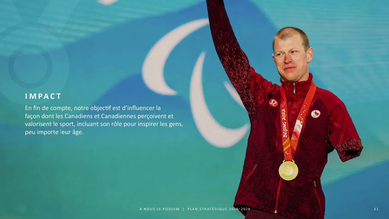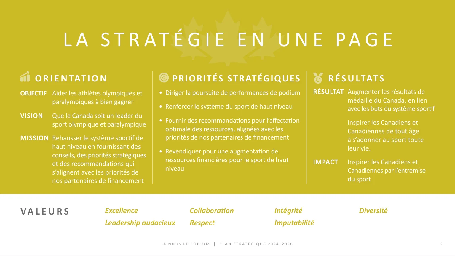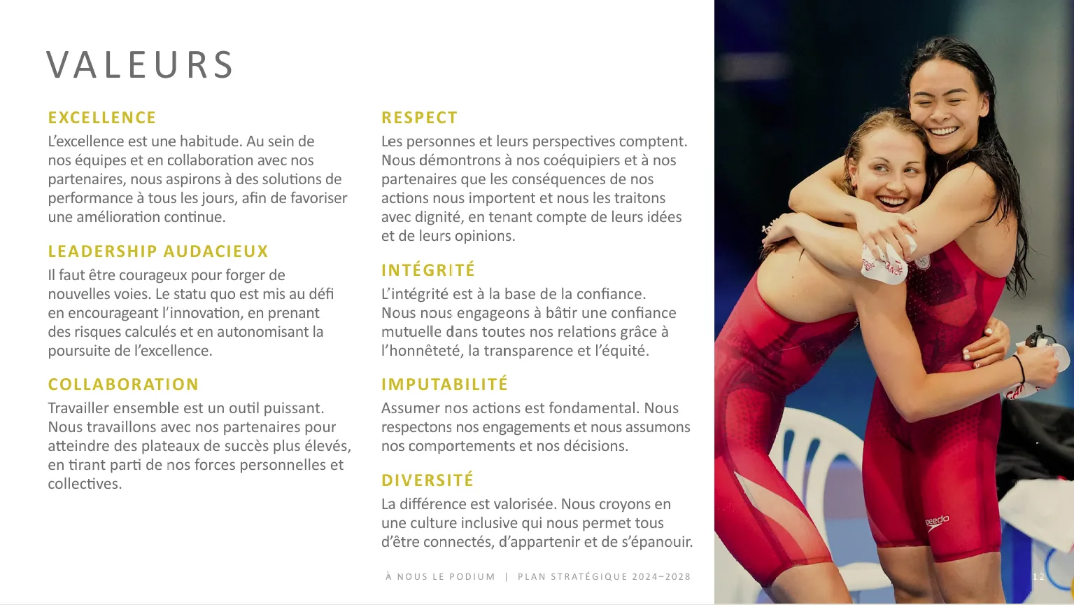 À nous le podium a lancé son Plan stratégique 2024-2028. Guidé par les valeurs fondamentales de l’organisation — excellence, collaboration, intégrité, diversité, leadership audacieux, respect et responsabilité — et axé sur les personnes, ce plan stratégique constitue une feuille de route pour concrétiser la raison d’être d’À nous le podium : soutenir les athlètes olympiques et paralympiques afin qu’ils gagnent avec intégrité.