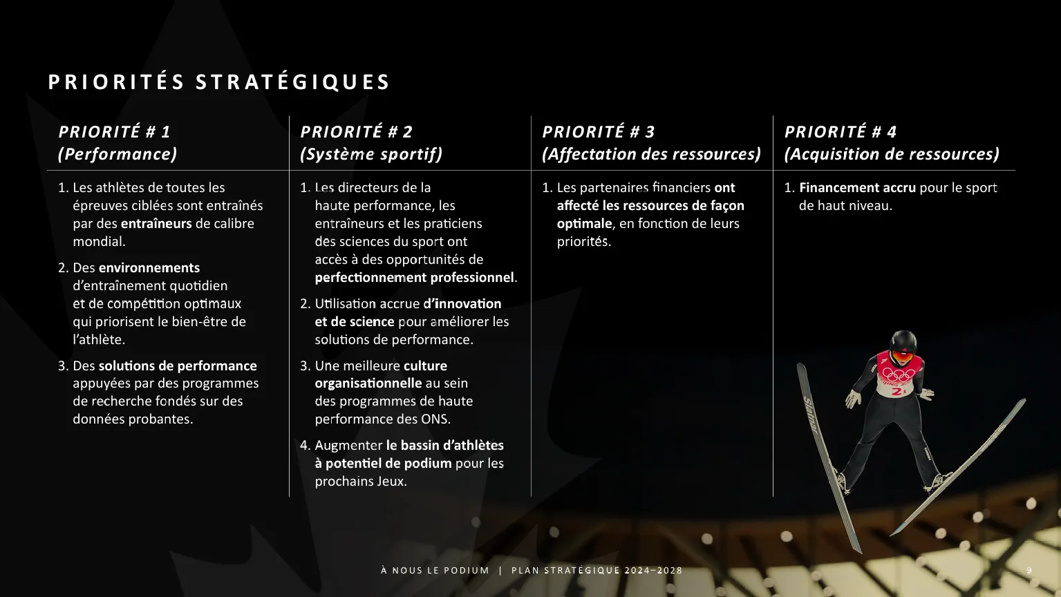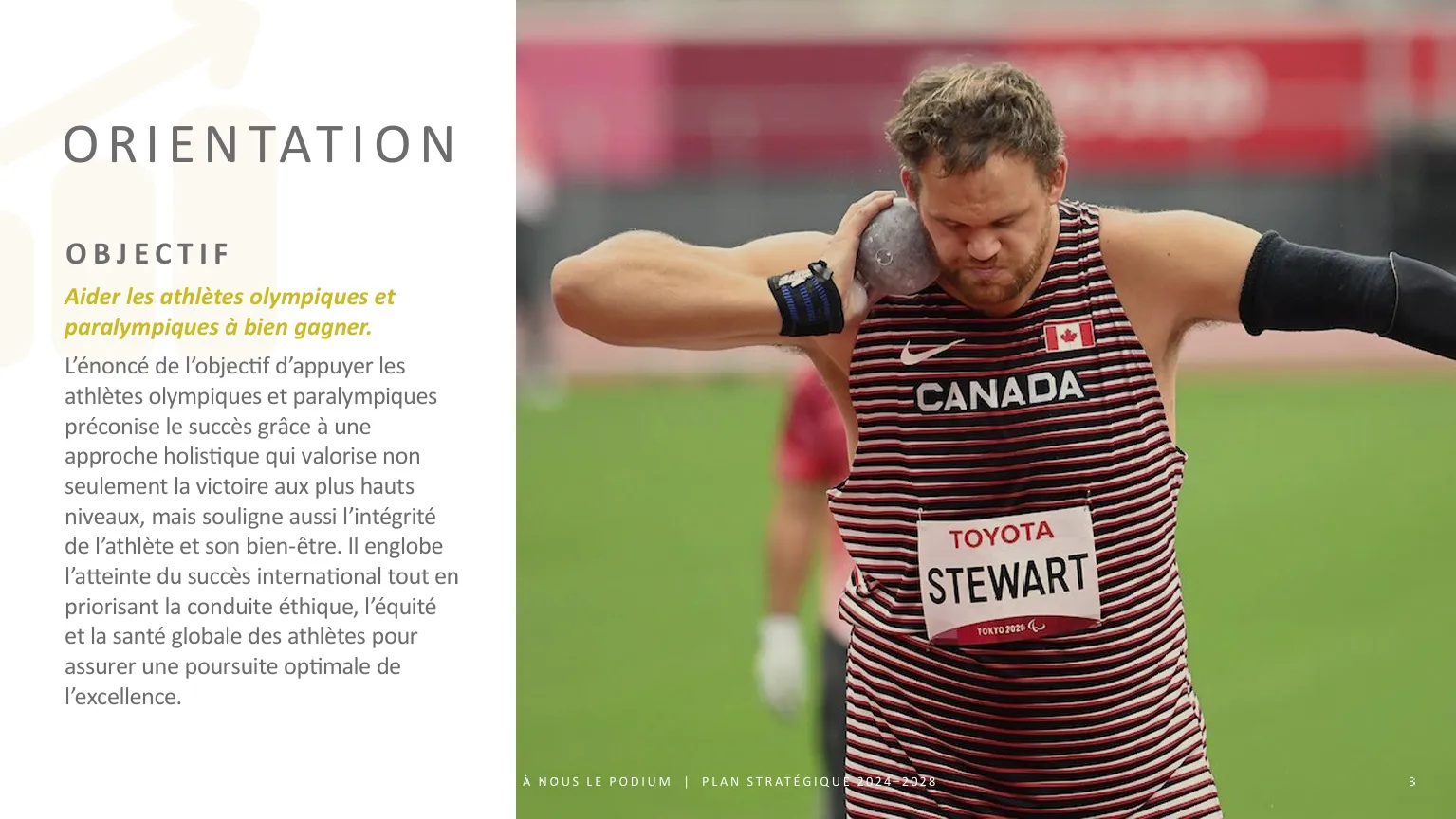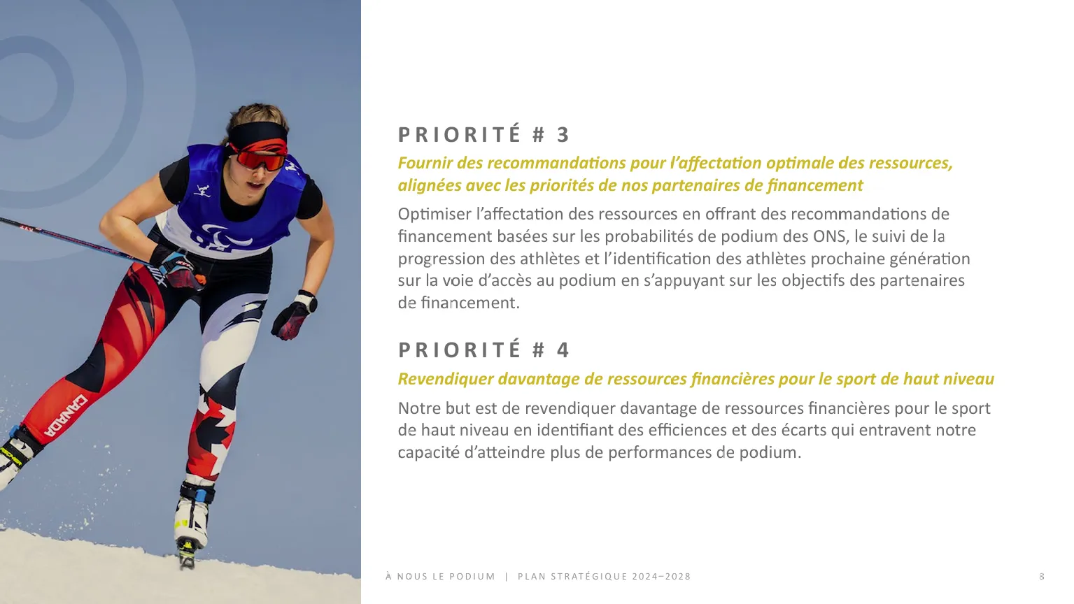 À nous le podium a lancé son Plan stratégique 2024-2028. Guidé par les valeurs fondamentales de l’organisation — excellence, collaboration, intégrité, diversité, leadership audacieux, respect et responsabilité — et axé sur les personnes, ce plan stratégique constitue une feuille de route pour concrétiser la raison d’être d’À nous le podium : soutenir les athlètes olympiques et paralympiques afin qu’ils gagnent avec intégrité.